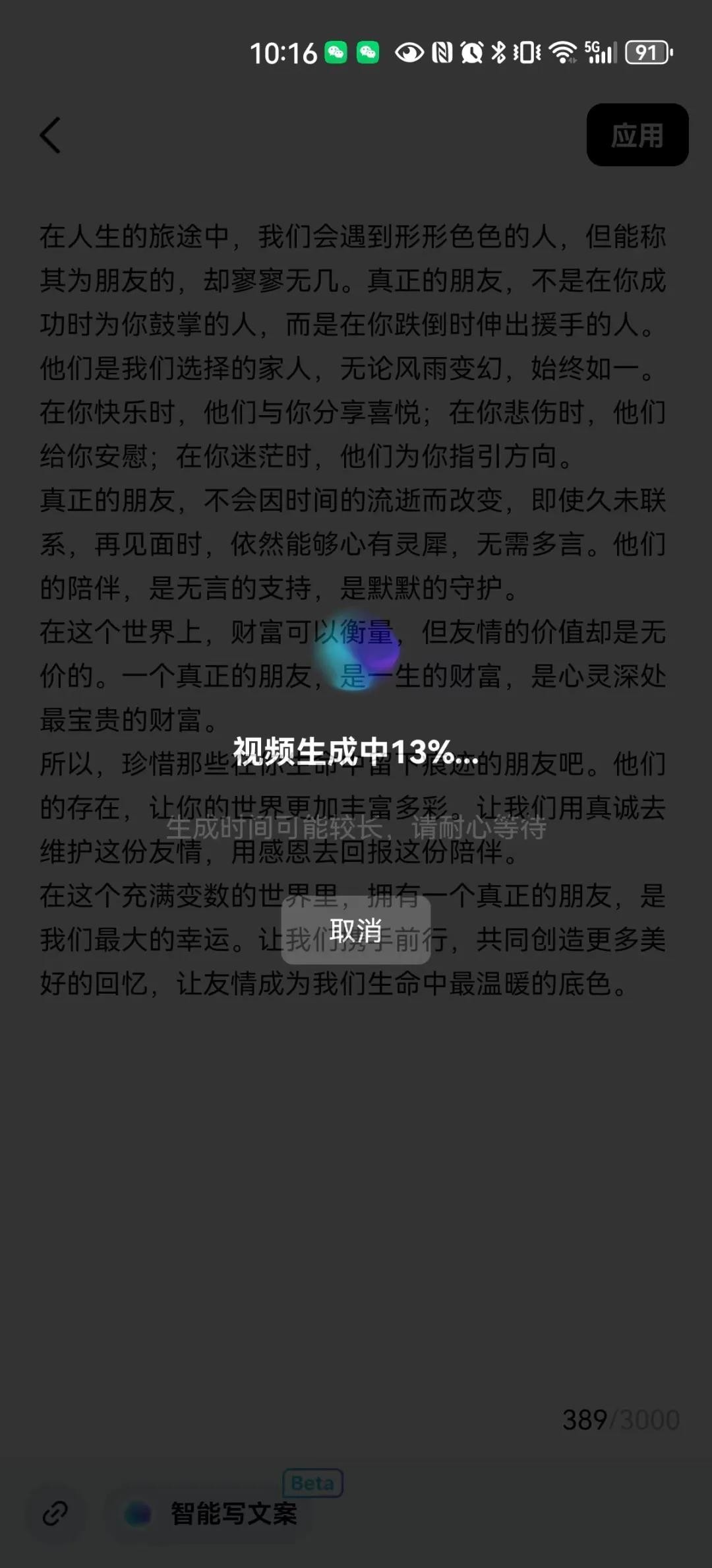 进入自由编辑文案界面,在文本框粘贴刚才从Kimi生成的文案,然后点击右上角【应用】。