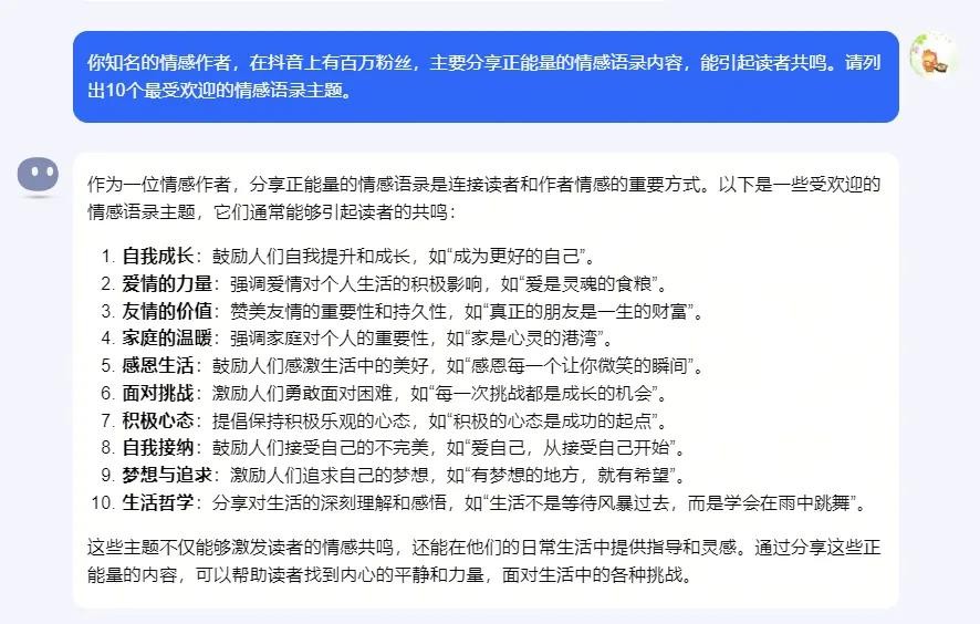 打开Kimi,简单描述下角色、背景,并要求它列出10个最受欢迎的情感语录主题。