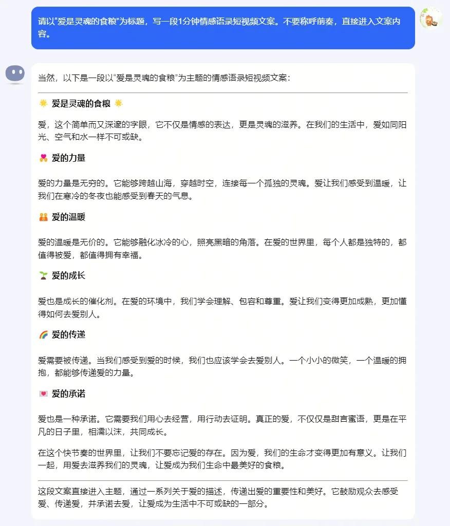 提示词:请以“爱是灵魂的食粮”为标题,写一段1分钟情感语录短视频文案。不要称呼前奏,直接进入文案内容。