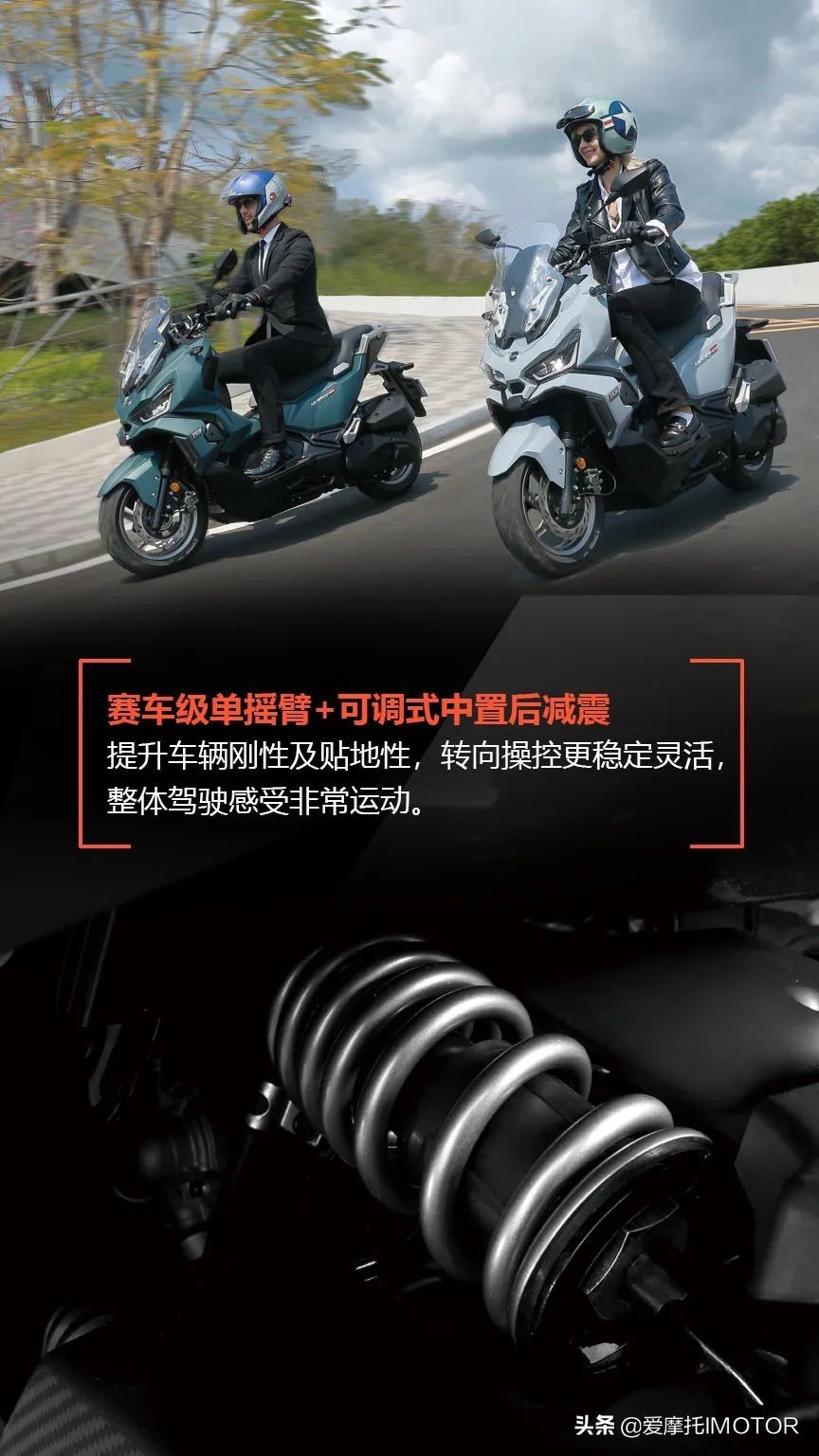 我们先不说这套东西好不好用,但至少中置减震相比传统的双减震看起来更简洁,车辆尾部会呈现镂空状态,动感十足。而实际上,参考三阳在售的DGR使用了类似的配置,在实际驾驶过程悬挂的钢性充足,车身重心较低,运动性能良好。