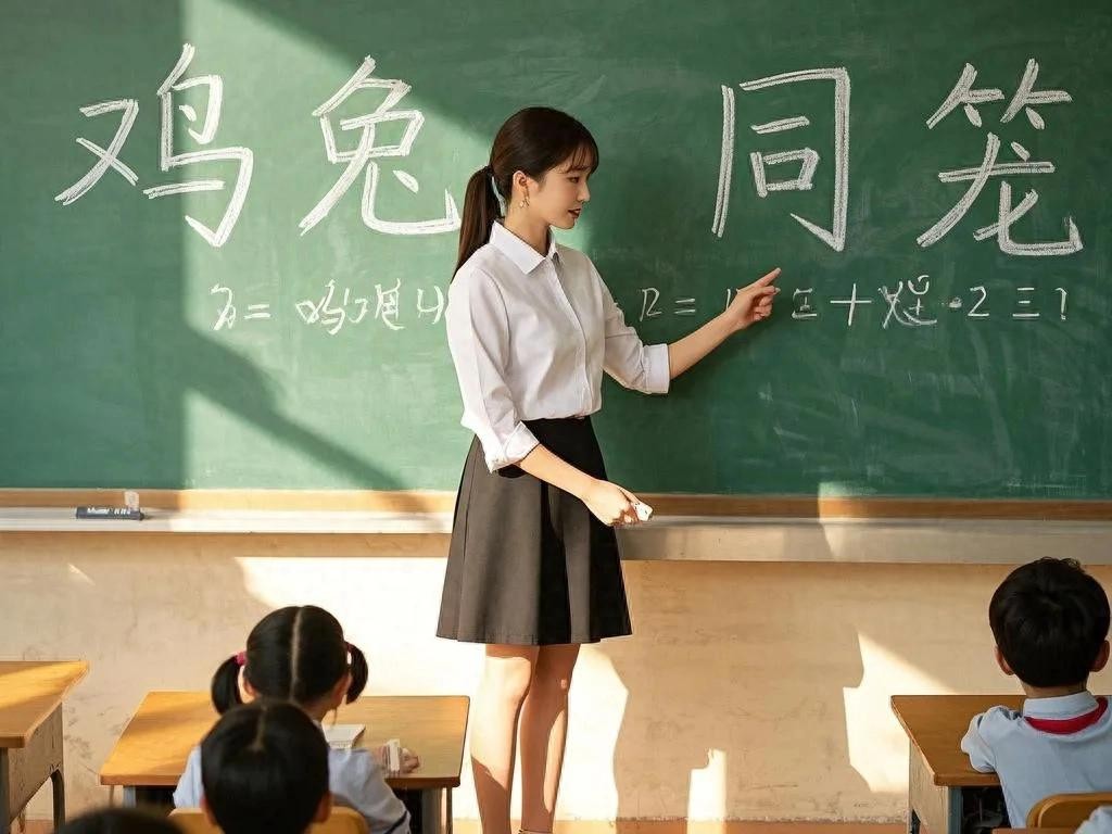 解答这道例题,我们不妨先采用“抬脚法”,众所周知,每只鸡有2条腿,每只兔子有4条腿,为了方便理解,首先我让笼子里的鸡和兔子全部起立,我拿着一个口哨,命令他们当听到“嘟”的一声响时全部抬起一只脚,“嘟………”,此时笼子里所有的鸡和兔子全部抬起一只脚,那么此时踩在地上鸡和兔子的脚的总只数就是96-36=60,当笼子里的鸡和兔子正在面面相觑,不知所措时,“嘟………”,哨声再次响起,兔子下意识的又抬起了一只脚,此时大公鸡正在金鸡独立,无奈的抬起了另外一只脚,大家知道,大公鸡只有2只脚,所以,此时仅有两只脚的大公鸡高高举着两只脚躺在了地上,再来看,此刻踩在地上脚的只数为96-36-36=24,而这剩余的24只脚全部为兔子的,而每只兔子还剩2只脚踩在地上,那么兔子的数量就是24÷2=12(只),而鸡的数量就是总只数减去兔子的数量,也就是36-12=24(只),至此该题解答完毕,通过这样的讲解,旨在激发孩子们的学习兴趣,通过寓教于乐的形式化解部分孩子对数学的抵触情绪。再来看一题。