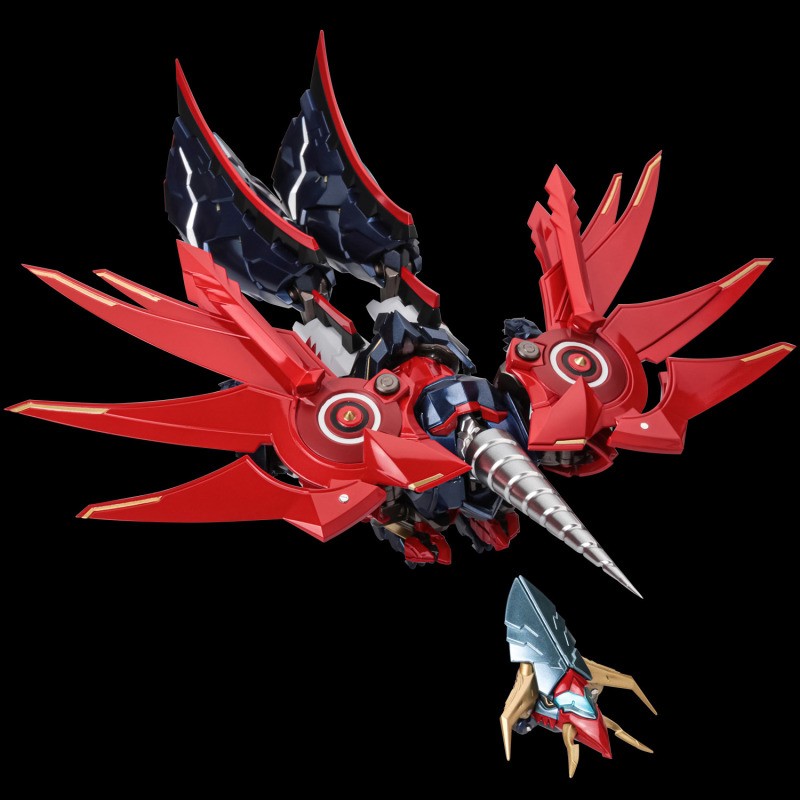 而翅膀部分也使用了全新的原创设计,该部分由多块零件组合而成,并配有展开结构,并可以使用可动支架将双翼移到机体前方,并且也可以变形为飞行姿态“GOD BIRD”结构。此外,头部也能患上钻头零件,再现封印的强化武器“GOD BIRD HEADCUTTER”。