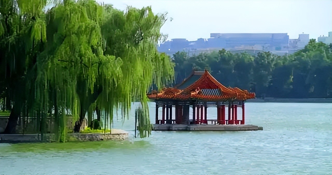 位于中南海(原太液池)内。《北京八景·太液晴波》诗曰:“禁苑香风散紫埃,晴波漾日自沿洄。天光下映银潢净,云影遥涵玉鉴开。”描述的正是太液池水波清澈,微风拂过而波光粼粼的美景。