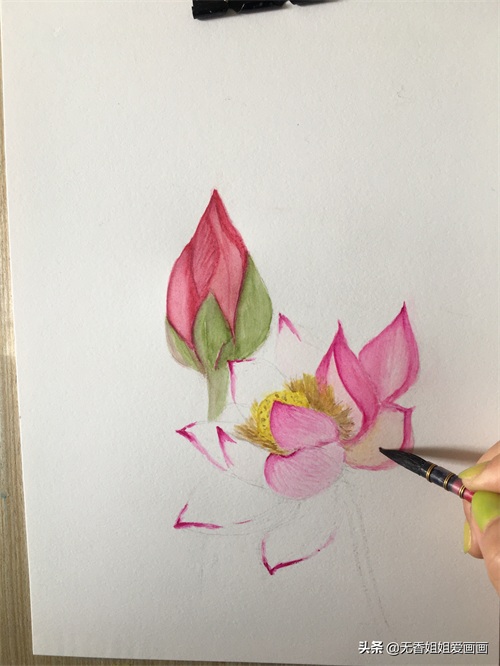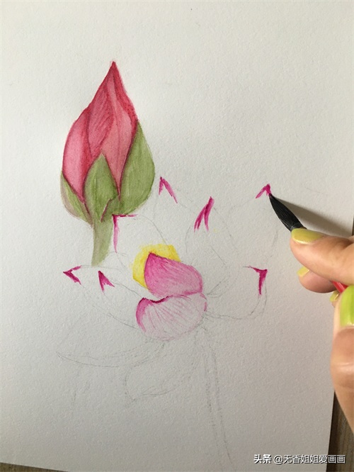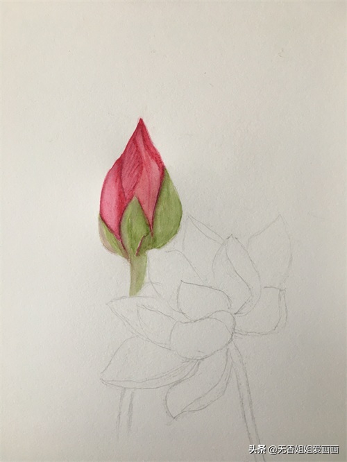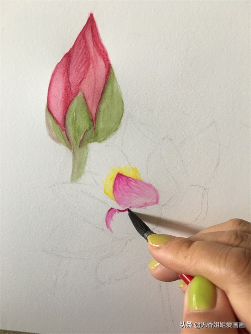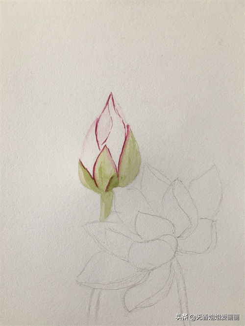 再然后用毛笔蘸浅绿涂抹花苞底部的苞片,注意色彩不宜过浓。(如下画面所示)