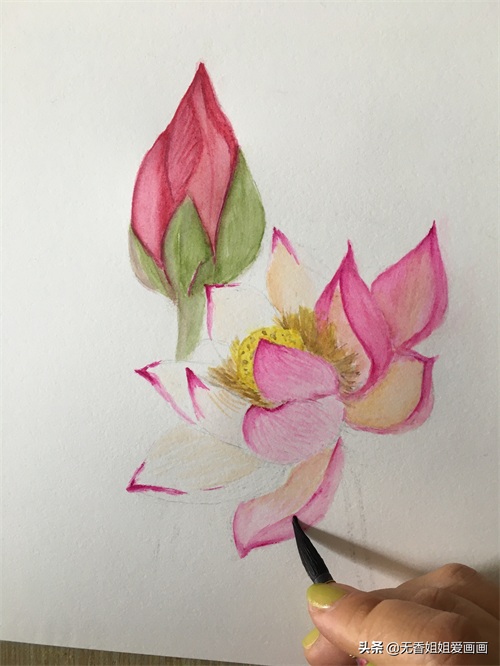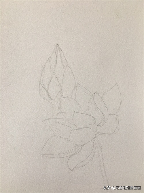 用铅笔在画纸是轻轻地勾勒出荷花和花苞的大致轮廓。注意下笔的时候力度尽量轻柔一些,以免画错更改时会留下深深的笔痕迹,从而影响了整体的视觉享受效果。