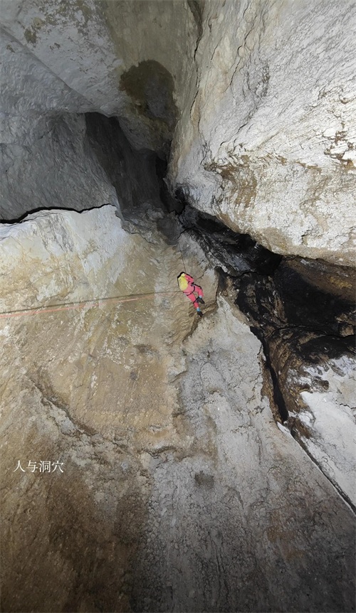 又遇到一个看不到底的竖井,但是已经用了三百多米绳索,带的绳索不够,只好沿路返回。因为时间不够,我们从早上十一点下降进来,到现在已经是下午五点多,还要上升一百六十米的崖壁,所以放弃了那个平洞的探索。