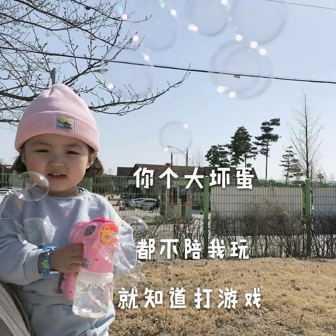 在这张表情包中可以看到小萌娃一个人玩的非常的开心,手中拿着泡泡机,吹出五颜六色的泡泡,看起来真的是非常的可爱。你这个大坏蛋,不陪玩我自己也和很开心,看起来是不是非常的可爱呢?