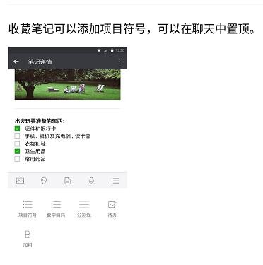 2、收藏笔记可添加项目符号,可在聊天中置顶