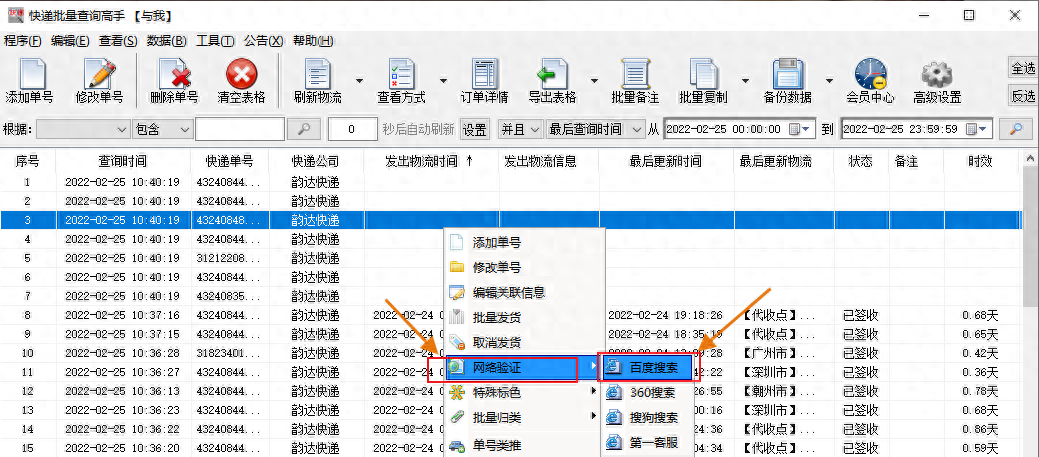 而刷新几遍之后,还是没有物流的话,可以右击该单号,选择下拉列表中“网络验证”下的“百度搜索”,看一下是否有物流
