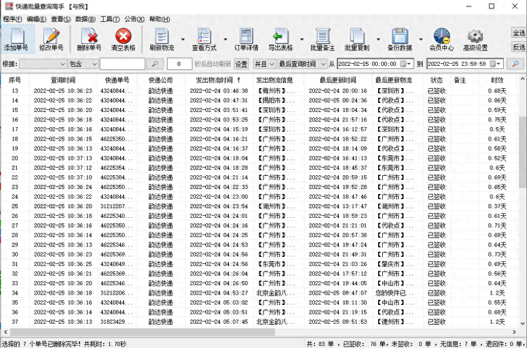 可以看到进度条滚动,说明正在查询所有快递单号,物流也一一显示出来