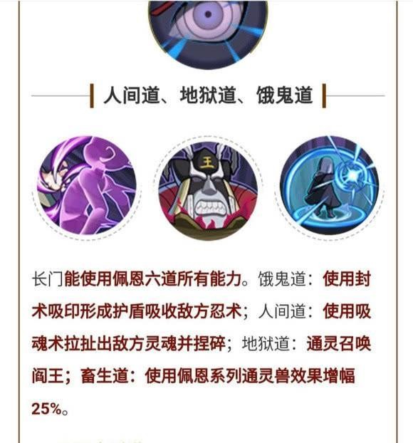 总之。。开大之后可以完美的接上修罗炮,伤害一般,还可以吧,但是让长门很没面子的是,和任何一个S忍者相比,对大必输,这就比较尴尬了..(这仅仅是小编个人吐槽一下)不过就算是大招不算强势,长门也是稳坐T1的位置,天王之下第一人。看到这你们有没有决觉的少了点什么,对了就是畜生道,佩恩系列所有的通灵效果增加25% 对于小编这种贫苦人民来说这个技能就忽略不计了