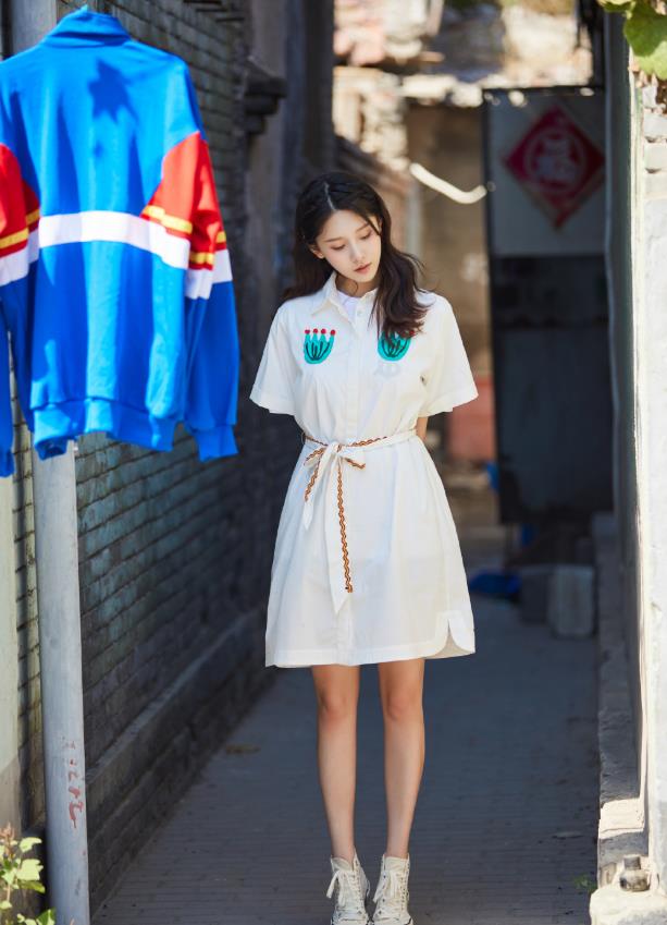 这条小白裙款式简洁,是很朴素简约的风格,在胸前用绿色印花作为点缀,增添些许精致亮点,倒也不会显得太单调;下面则搭配红白拼色缝线腰带,勾勒出纤细小蛮腰,更显窈窕迷人。