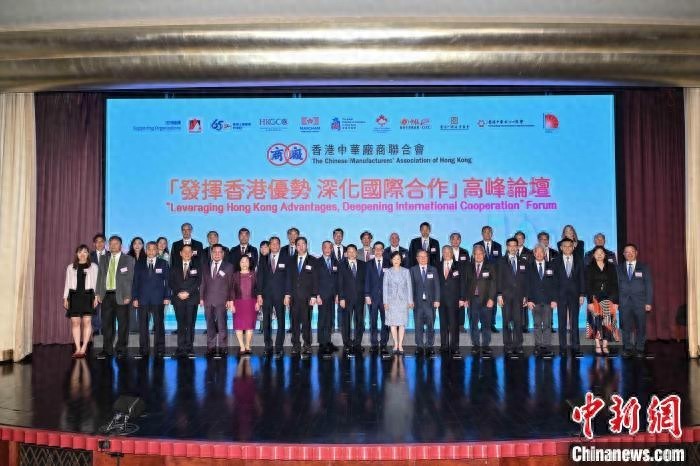 5月9日,香港中华厂商联合会在港举办“发挥香港优势 深化国际合作”高峰论坛。图为与会嘉宾合影。(香港中华厂商联合会供图)