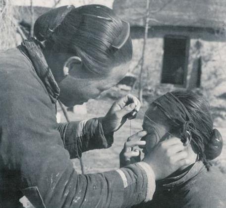 年轻人看了图片一定很奇怪:那个年纪稍长的女人双手和嘴里是什么?她要干什么?答案很简单:这是过去中国女人的一种美容方法——绞脸!
