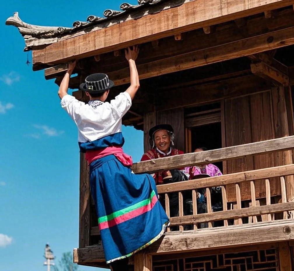 走婚,简单来说,是摩梭男女之间一种特殊的婚恋方式。当夜幕降临,如果一个摩梭小伙子钟情于某个姑娘,他会在白天通过各种方式向姑娘表达心意,比如帮她干农活、在篝火晚会上眉目传情等。得到姑娘默许后,等到夜晚,小伙子便会在约定的时间,悄悄来到姑娘的花楼前。花楼,对于摩梭姑娘来说,是她们的私密空间。男子不能从正门进入,需要爬窗,将帽子和随身配件挂在门外,示意两人正在约会,不希望被打扰,之后男子需要凭借自己爬上高高的花楼,同时也需要在天亮之前离开,这时便可以从屋子正门离开了。