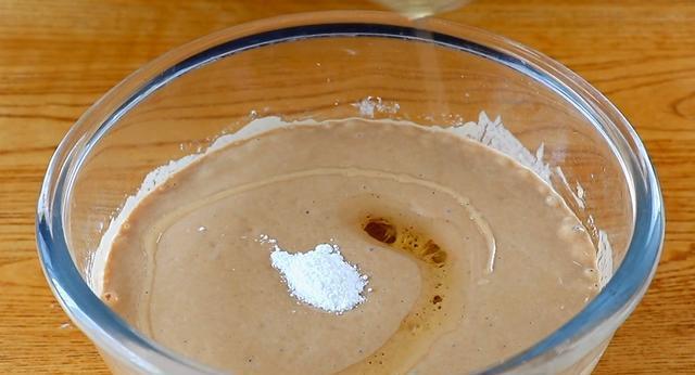 4,面糊醒发好之后加入3克泡打粉,15毫升食用油,搅拌混合均匀,把里面的气泡全部搅打出来。