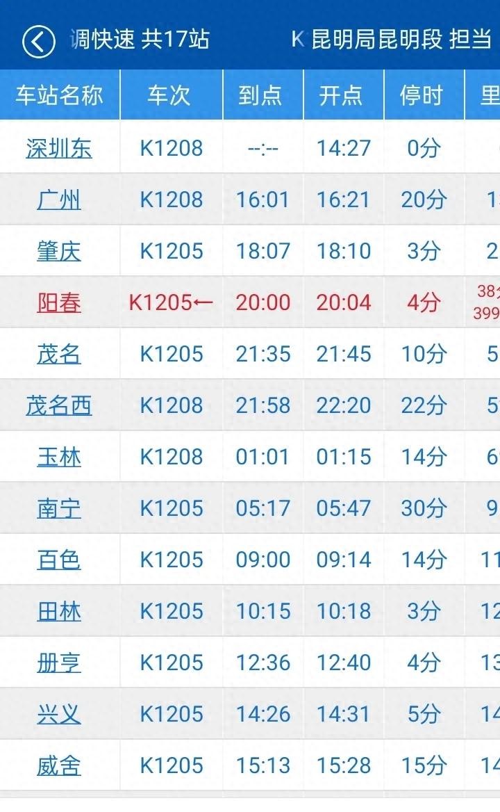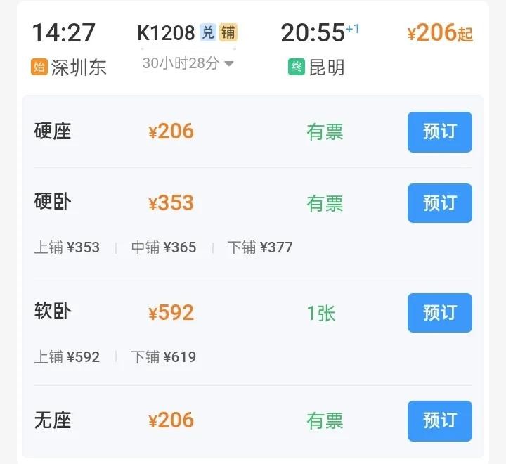 K1208也是目前唯一一趟从深圳到昆明的普速列车,列车在深圳东站始发的时间为下午14:27,抵达终点站昆明站的时间为第二天晚上20:55。除了这趟普速列车以外每天还有4趟深圳到昆明的高铁列车,高铁用时大概需要七个半小时左右,相比于普速车还是快了不少。