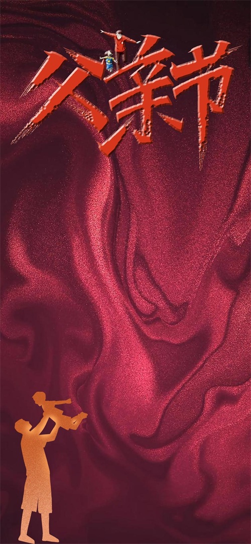 下面这张壁纸是福图一刻的父亲节海报壁纸,上方放置了父亲节文字元素,背景是红色绸布,下方放置了父亲举起孩子的图片元素。