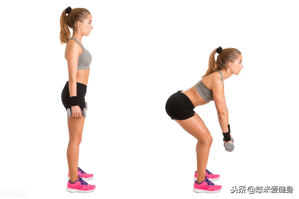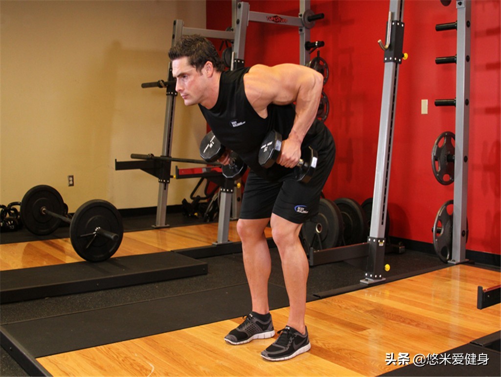 注意:身体躯干与地面接近平行,哑铃需要向后划动,而不是直接向上提起。