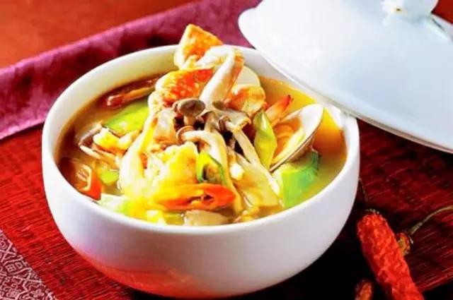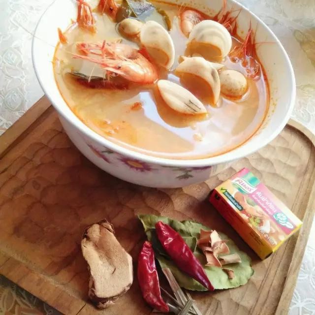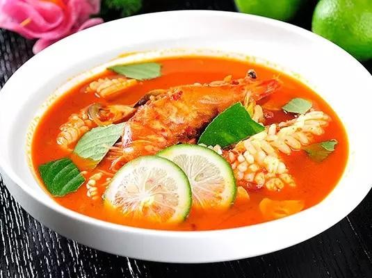 是一道泰国名汤,典型的泰国菜,是世界十大名汤之一,在泰语中,“冬荫”指酸辣,“功”即是虾,合起来就是酸辣虾汤了。冬荫功汤是将辅料放入桶煲至出味,而后放入大头虾、鱼露、草菇、花奶、椰汁等一起炖煮,酸味鲜美开胃。这汤以色泽全红,汤味馥郁可口,辣度十足的为佳。