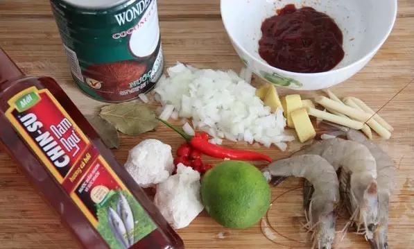 2.虾切下头部,去沙线。蛤蜊烫至开口。 起油锅,放入少许橄榄油,虾头和虾身一同入锅煸炒至变色,取出备用。再加适量油入锅,将小红椒,姜,香茅,番茄,蘑菇一同放入煸炒,加入适量的水,再加入虾头,柠檬片,九层塔,薄荷叶,烧开后加入椰浆和淡奶油,搅匀,换小火,煮20分钟。(可以根据口味多加点椰浆和淡奶油,更香)煮好后,加盐,和两小勺鱼露调味。