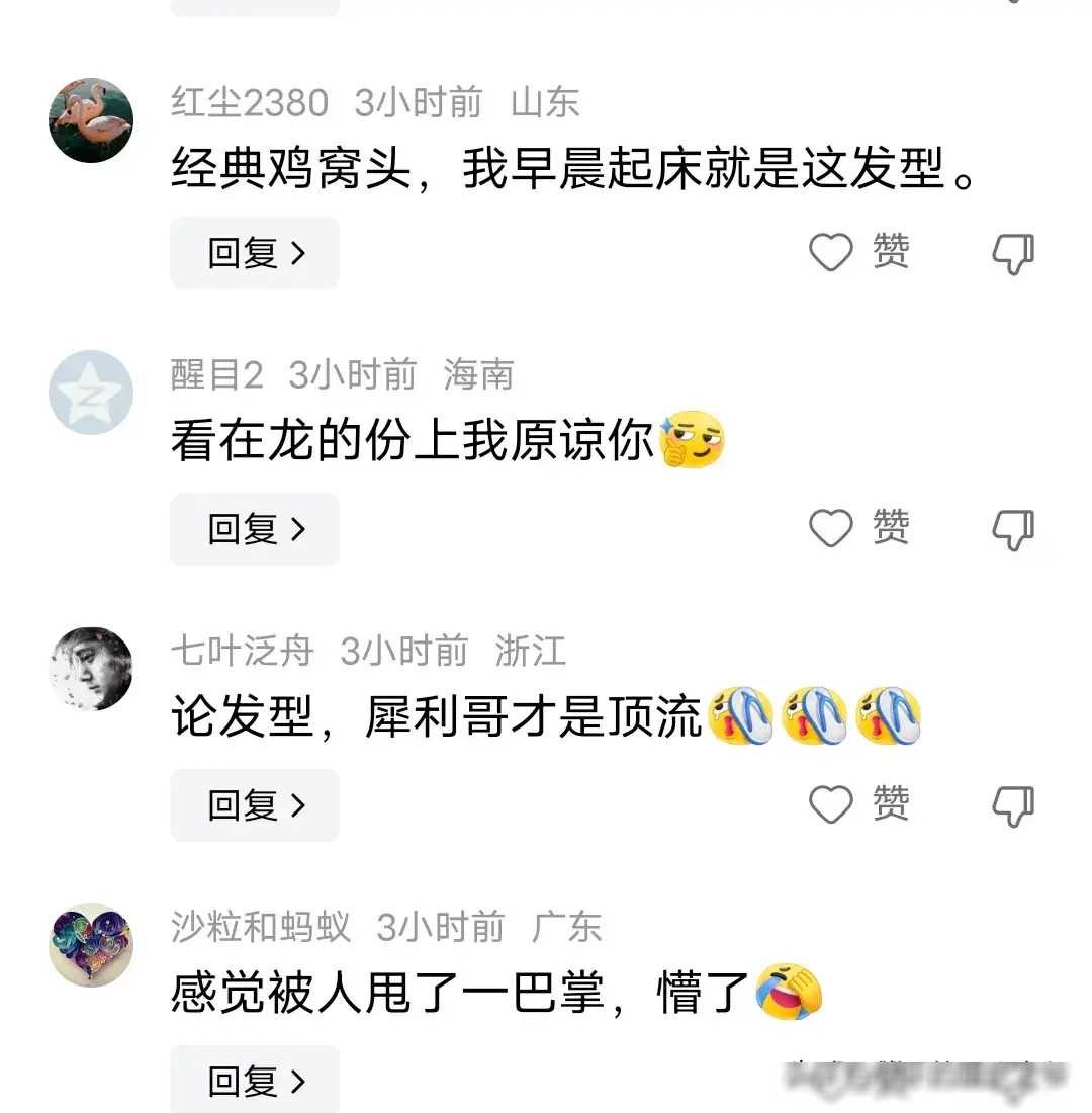 还有人戏称这个发型的唯一好处是好打理,每次用手一撸就行了,梳子都可以丢一边了。实用性成为了发型的一大亮点,这样的设计不仅独特,还方便日常打理,给人一种轻松自在的感觉。