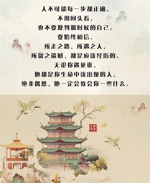 人不可能每一步都正确,不用回头看,也不要批判那时候的自己。要始终相信,所走之路,所遇之人,所留之遗憾,都是应该经历的。无论你遇见谁,他都是你生命中该出现的人,绝非偶然,他一定会教会你一些什么。