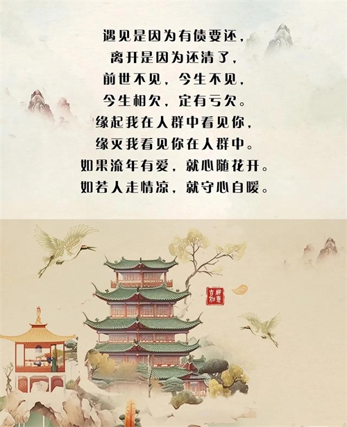 遇见是因为有债要还,离开是因为还清了,前世不见,今生不见,今生相欠,定有亏欠。缘起我在人群中看见你,缘灭我看见你在人群中。如果流年有爱,就心随花开。如若人走情凉,就守心自暖。
