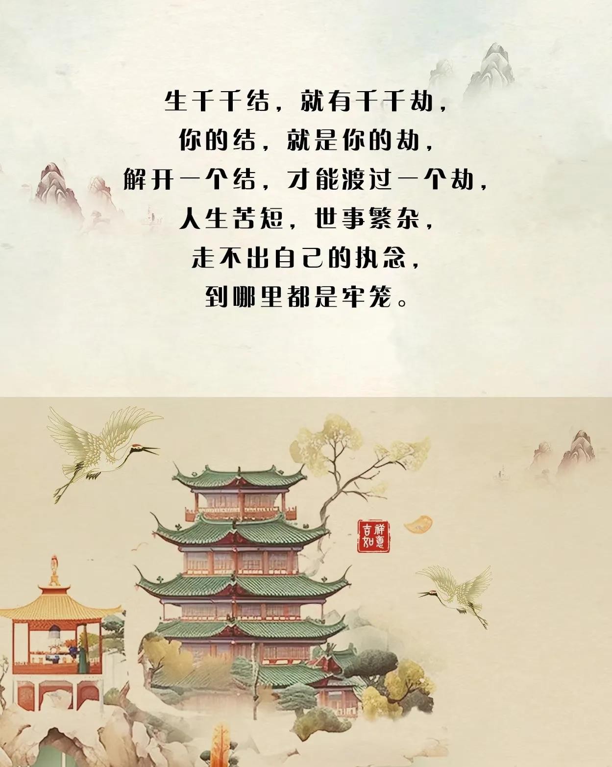 生千千结,就有千千劫,你的结,就是你的劫,解开一个结,才能渡过一个劫,人生苦短,世事繁杂,走不出自己的执念,到哪里都是牢笼。