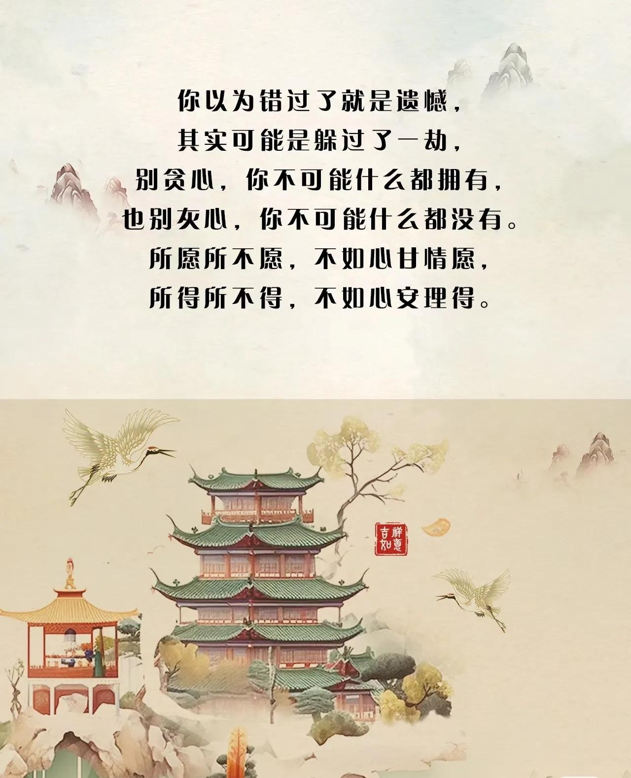 你以为错过了就是遗憾,其实可能是躲过了一劫,别贪心,你不可能什么都拥有,也别灰心,你不可能什么都没有。所愿所不愿,不如心甘情愿,所得所不得,不如心安理得。