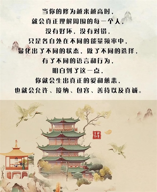 当你的修为越来越高时,就会真正理解周围的每一个人,没有好坏,没有对错,只是各自处在不同的能量频率中,显化出了不同的状态,做了不同的选择,有了不同的语言和行为,明白到了这一点,你就会生出真正的爱和慈悲,也就会允许、接纳、包容、善待以及真诚。