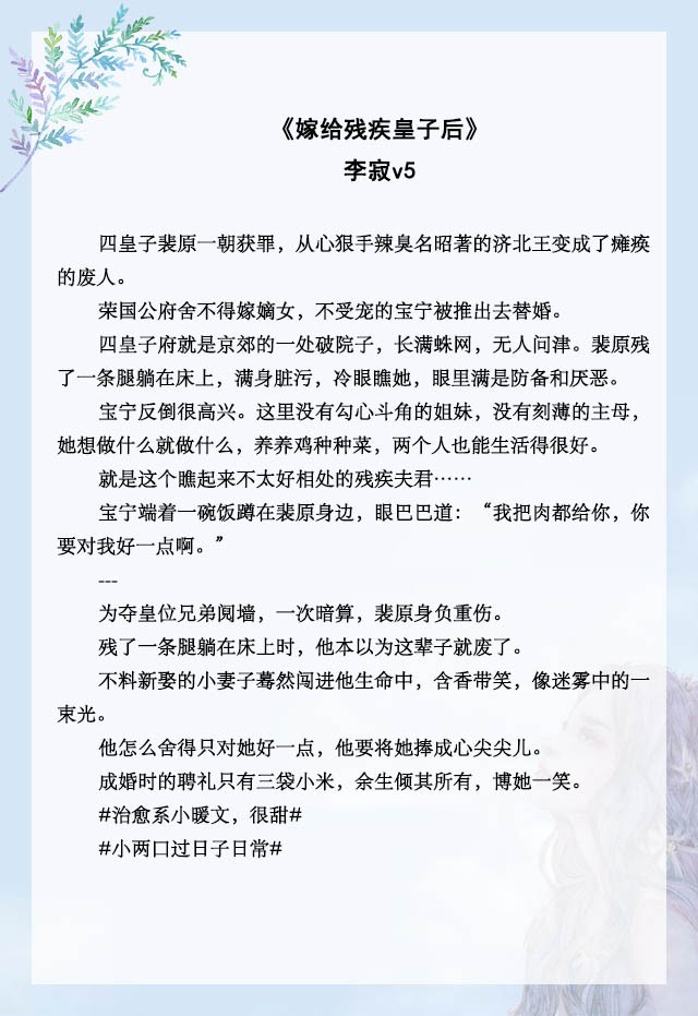 七七给小天使们推一波男主身有残疾的治愈系小甜文,前两本古言,后三本现言。