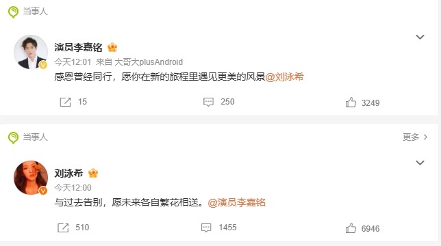 在娱乐圈这个看似繁华热闹的名利场中,明星们的感情生活一直是大众关注的焦点。2 月 20 日中午,刘泳希和李嘉铭分别在微博上发文,平静地宣布了离婚的消息,这一消息如同一颗石子投入心湖,激起千层浪,也让无数曾经为他们的爱情感动的粉丝们为之扼腕叹息。