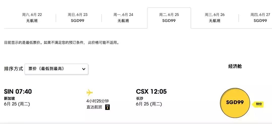 新加坡往返长沙的航班6月20日首航,去程最低价是99新币。