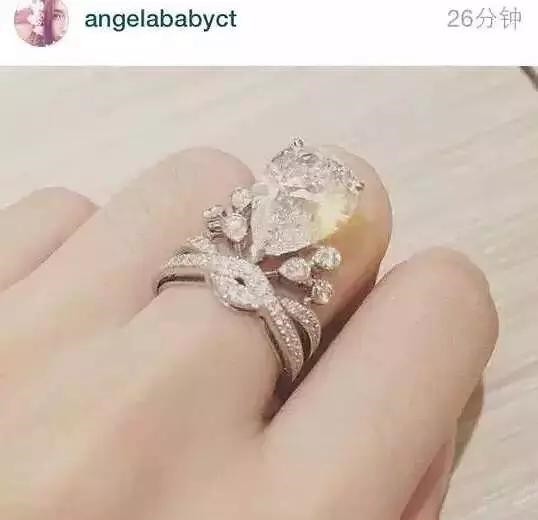 杨颖与黄晓明结婚时,那枚钻戒是由5.53克拉梨形切割的钻石,以及73颗明亮式切割钻石镶嵌而成,据说价值过千万。