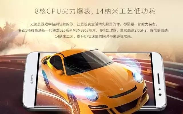 华为麦芒5搭载八核骁龙625处理器,使用了最新一代的14nm工艺制程,与上一代的骁龙617相比,功耗节省35%,配备了八颗Cortex-A53处理核心,主频高达2GHz。因为采用了14nm的制造工艺,其性能较为出众,同时功耗控制也非常出色。