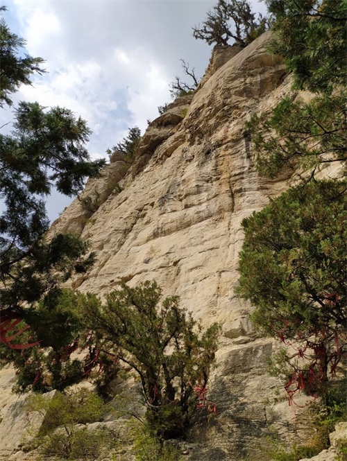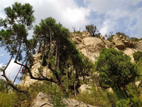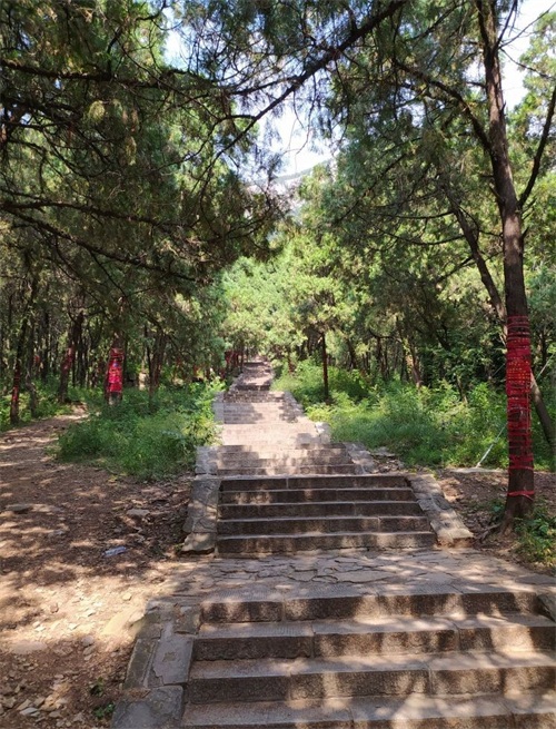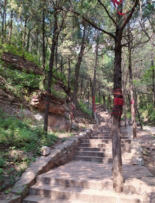 左半部分基本是遗迹遗址,返回入口寺庙处,向右前行,就是爬山了,山路时陡时缓,路旁树上被系上很多红丝带,祈求平安。