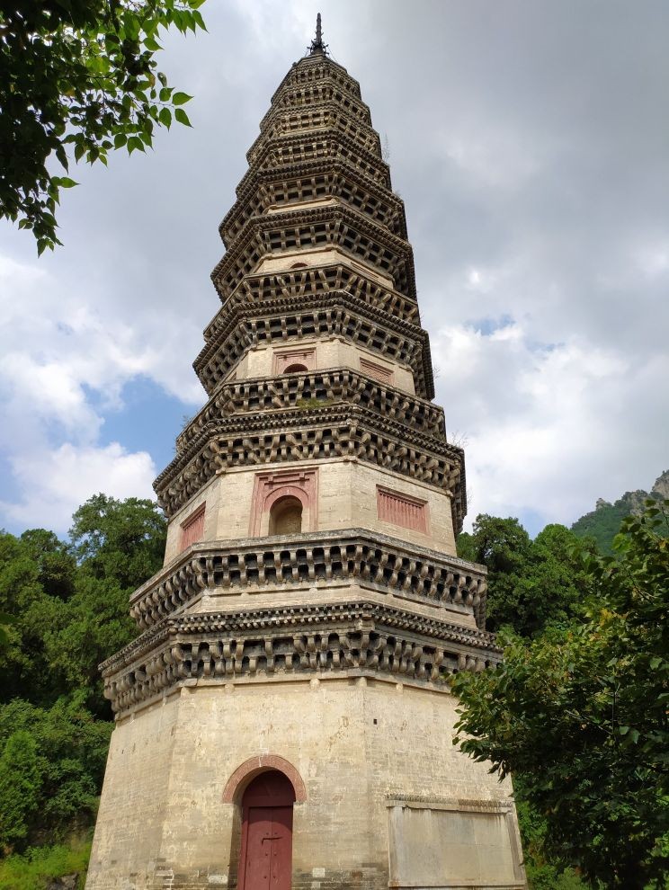 这个佛塔叫辟支塔(佛教用语),为一座八角九层楼阁式砖塔,塔高55.7米,塔基为石筑八角,上有浮雕,历时63年为宋代复建。