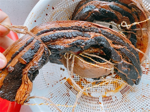 7、时间到,取出五花肉,你会发现这个五花肉的颜色已经很浓郁了,绑上绳子,沥干表面的酱油,放在室外淋不到雨的位置晾晒,在外面,经过柔弱的光照和腊月的寒风,微生物发酵会产生鲜味,这个就是酱油肉的鲜味,经过发酵的酱油肉,味道简直完美;