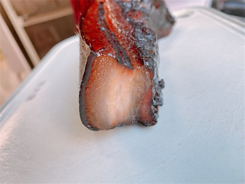 10、晒好的酱油肉,和之前用生抽老抽搭配香料腌制的做一个对比,用酱油腌制的五花肉颜色会更深一点;