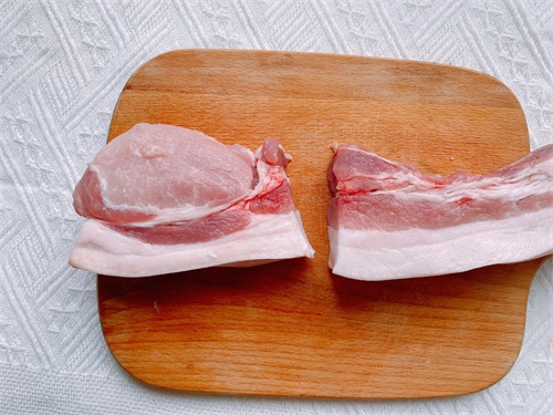 2、现在买回家的五花肉都是带有上面的大排肉的,我习惯将上面部分切下来,只用五花肉,切来的肉可以用来做香肠或者平时炒菜都可以;