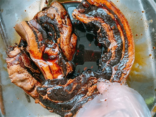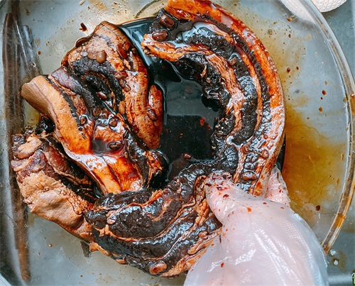 5、搅拌均匀之后,把五花肉放进来,戴上手套,将酱油均匀的涂抹在五花肉上,多揉搓一下,之后覆盖上保鲜膜,腌制一天;