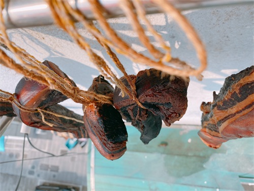 9、酱油肉晾晒7天左右,晾晒到肉质收紧表面有油脂渗出来,用手捏一下,明显感觉到表皮是硬的,这时候就可以把肉收回来了,酱油肉可以室温保温,阴凉干燥的位置放1-2个月左右是没有问题的,等到春节过后,温度回升了,建议冰箱冷藏保存或者冷冻保存;