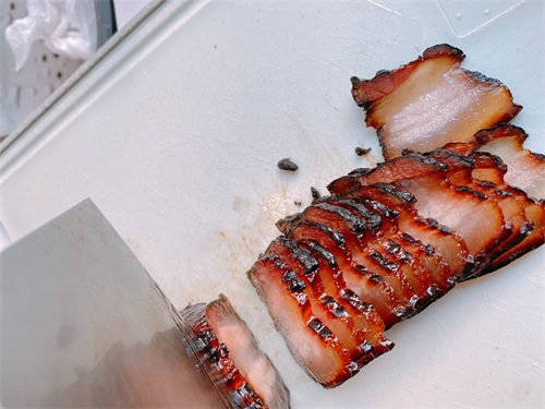 12、酱油肉整块蒸的时候需要时间较久,但是整块蒸出来的酱油肉味道会更好,稍微晾凉之后就切片,你能闻到油脂的香味,肉质是晶莹剔透的,看着就流口水;