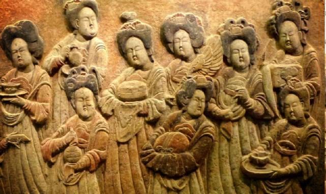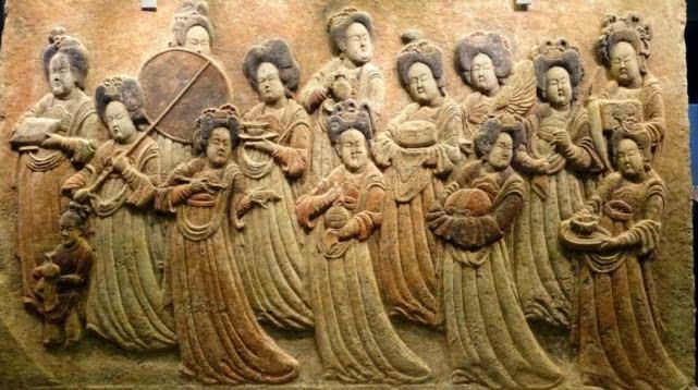 彩绘浮雕《散乐图》中,女子的体态、服饰、发式、妆容,皆有“晚唐遗风”。所有女性形象,无一不是面部圆润,丰满秀丽,其整体形貌,体现了当时人们崇尚丰肥浓丽的审美观,也反映了当时社会的繁荣与富足。