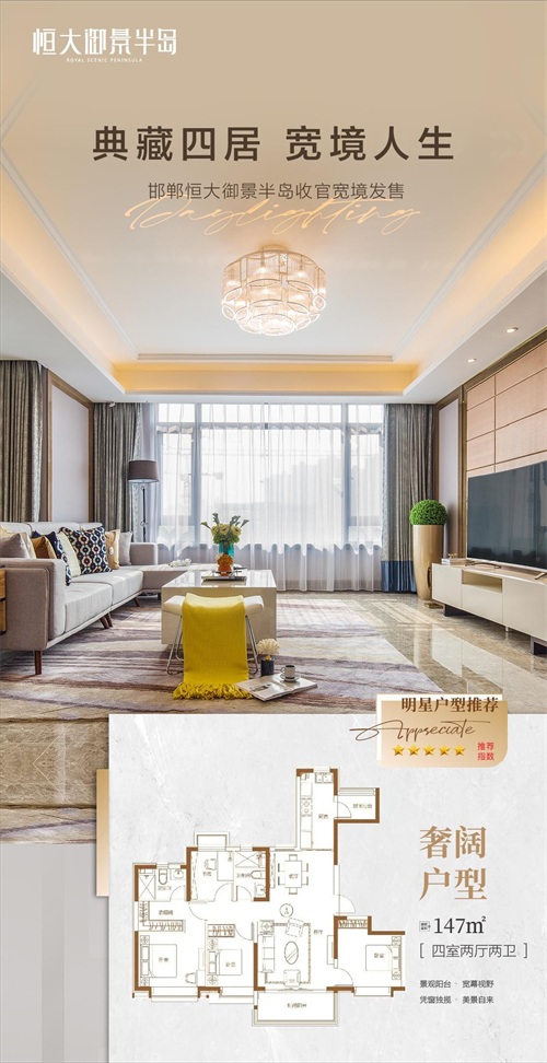 在项目收官之际,邯郸恒大御景半岛推出5套收官珍藏房源,建面约147㎡低密宽境 奢阔四居,将美好延续。用居住的宽度,容纳家人快乐的温度。