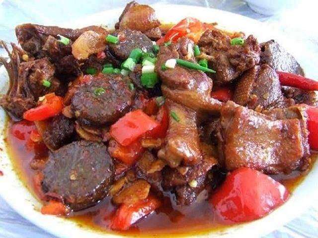 血粑鸭是湘西非常有民族特色的一道菜肴,用鸭肉和糯米血肠加入各种调料烹饪而成,鸭肉酥烂入味,香味浓郁。与血肠搭配在一起,滋味悠长,值得回味。