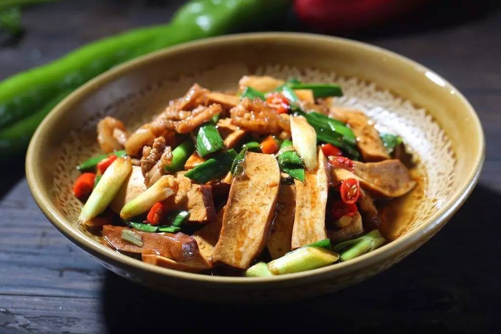 攸县香干是攸县的传统豆制品,外韧里嫩,豆香味浓郁。配上辣椒、蒜苗等一起翻炒,味道非常的独特,十分美味下饭。