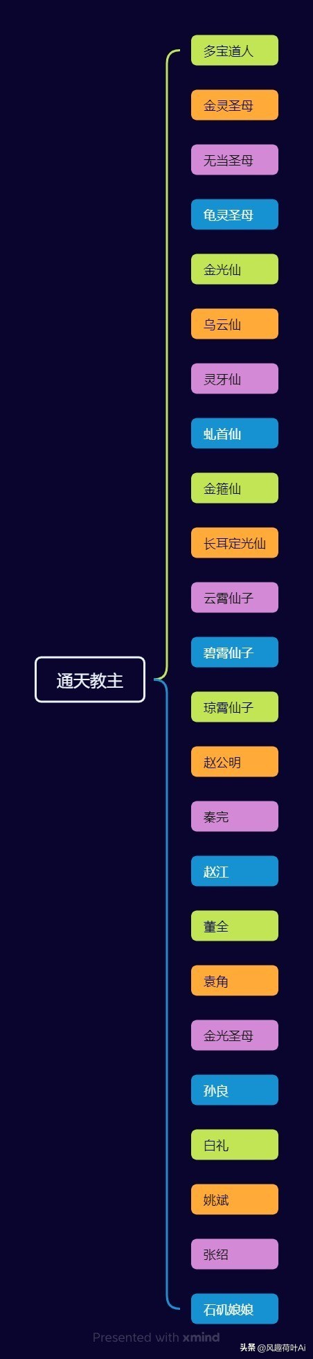 通天教主是截教的教主,他的弟子众多,其中最有名的就是多宝道人,金灵圣母,无当圣母,龟灵圣母,赵公明和三霄娘娘,下图就是我整理的通天教主的徒弟图谱。