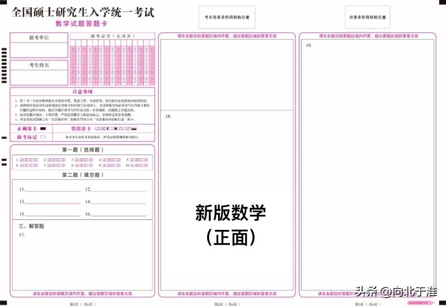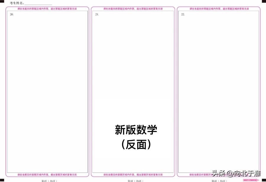 数学题型在2021年发生了变化,答题卡的样式也发生了变化,由原来的两张纸变成1张纸(每一面分成3小页,共6页)。